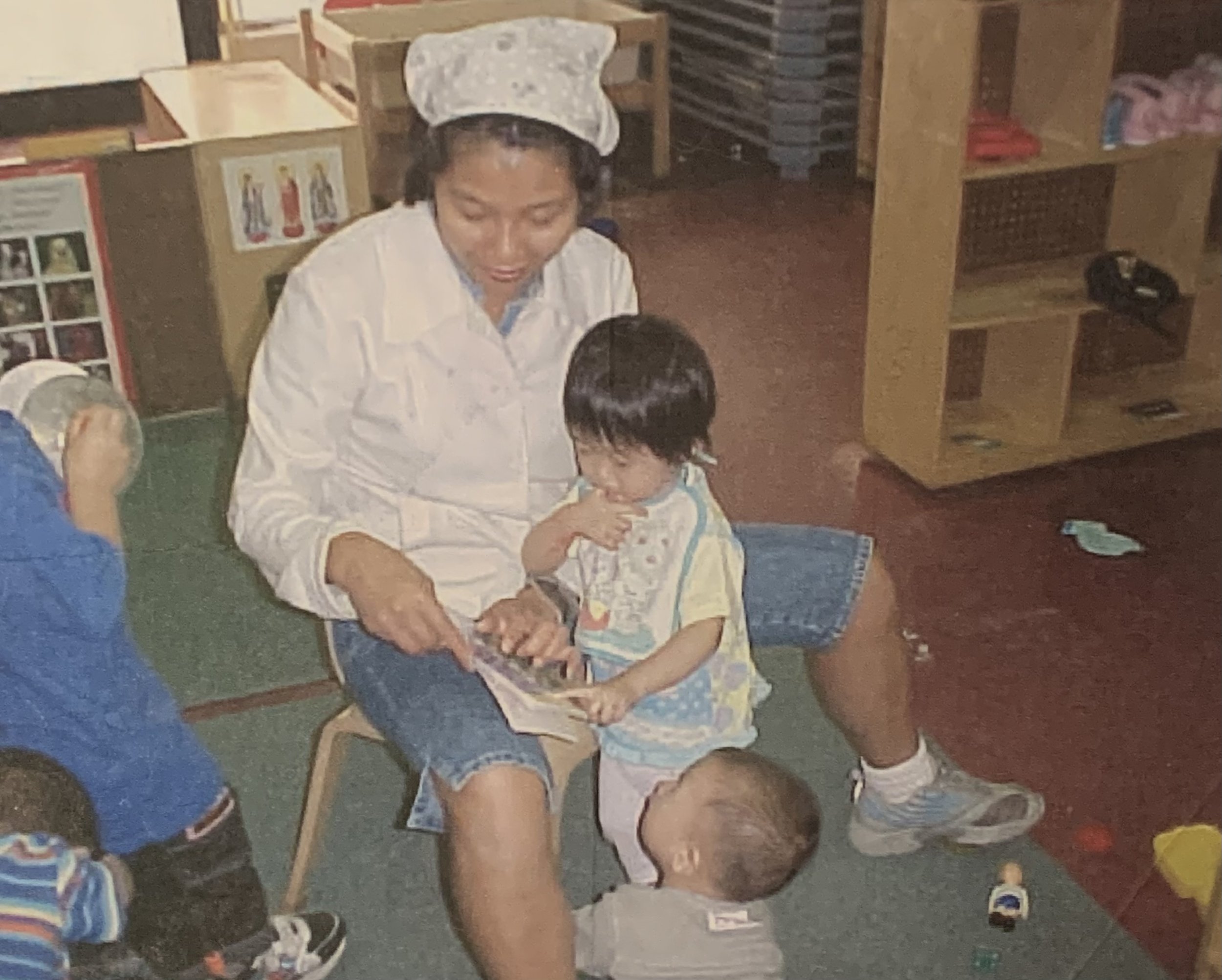 Michelle as a toddler, reading with Ms. Felicia, a fantastic teacher who just rejoined our staff!